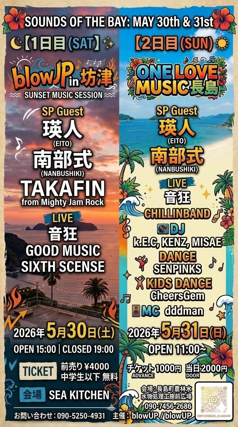 2026年5月30日(土)・31日(日)の2日間にわたり鹿児島にて開催される「blowJP in 坊津 SUNSET MUSIC SESSION」&「ONE LOVE MUSIC 長島」。